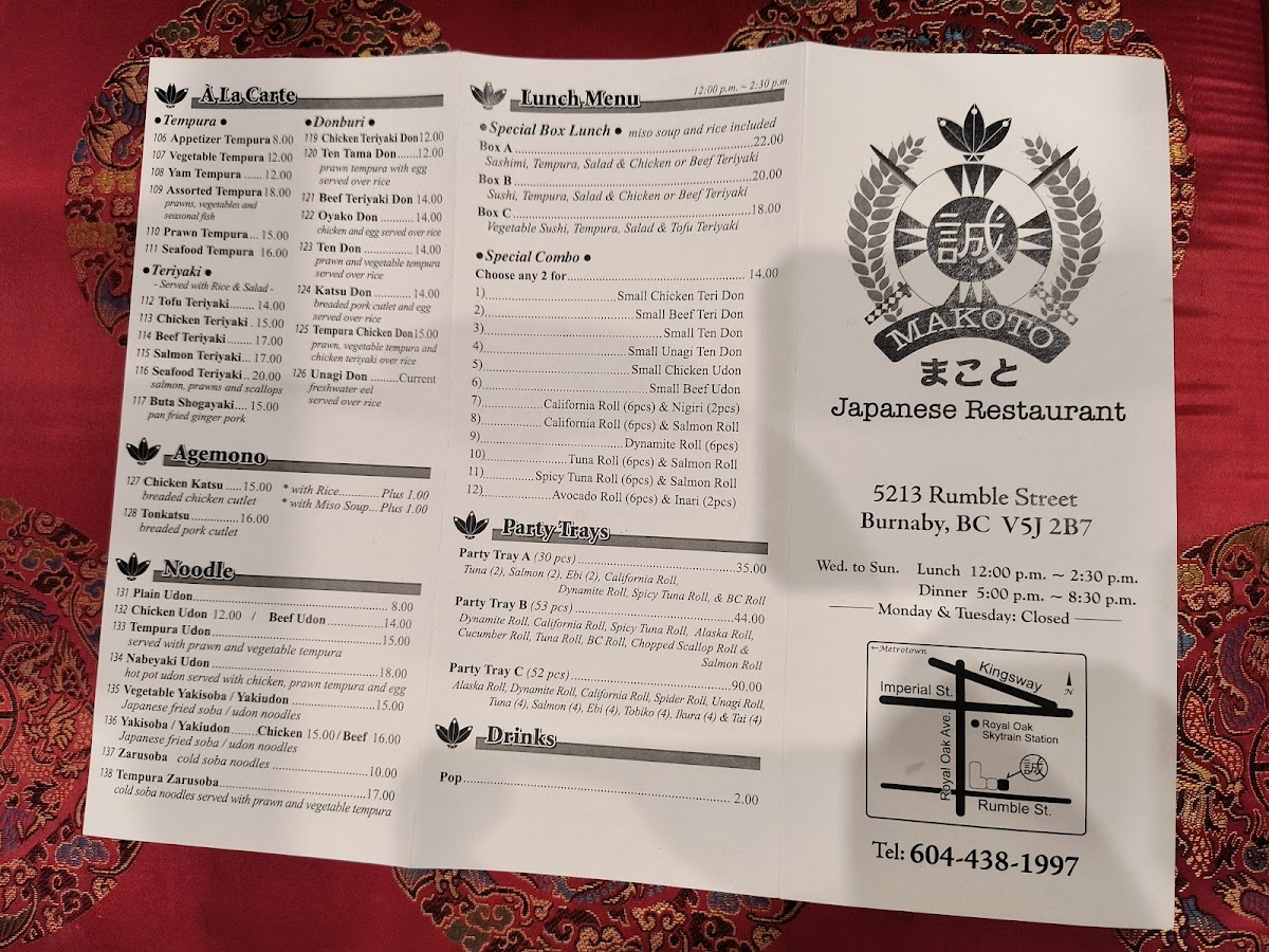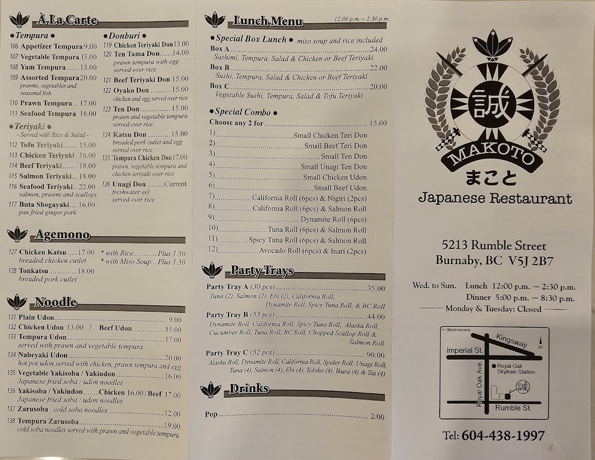 Welcome to Makoto Japanese Restaurant in Burnaby, a delightful haven for authentic Japanese cuisine. Nestled at 5213 Rumble St, this charming eatery is a family-run establishment known for its warm hospitality and cozy ambiance. The menu boasts a diverse selection of maki rolls, featuring standout options like the Spicy Tuna Roll, Caterpillar Roll, and Natto Roll, showcasing fresh ingredients and classic flavor combinations.